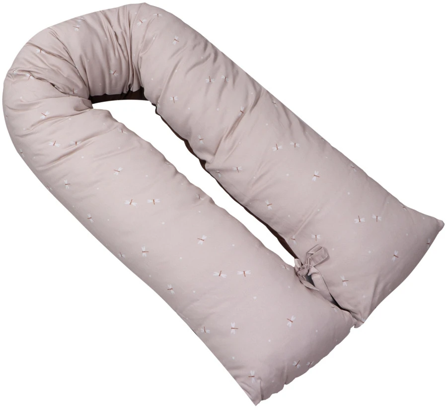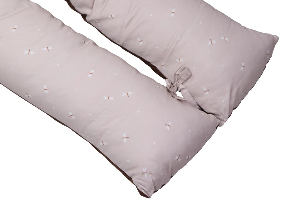 Het voedingskussen heeft een mooie print en een uni-kleurige kant: hierdoor kun je zelf kiezen welke kant je boven legt. Daarbij is hij voorzien van een afritsbare hoes die met de hand gewassen kan worden. Om de ronden vorm te behouden als je kleintje er op zit of tijdens het voeden, zitten er 2 touwtjes aan het einde van het voedingskussen die aan elkaar geknoopt kunnen worden. De lengte van het voedingskussen is 155 cm.